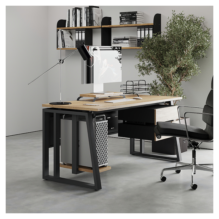 Офисный стол Кобор TS2-160/80 black/natural используется в офисных помещениях и кабинетах руководителей. Модель оснащена усиленными вертикальными балками опорами в форме наклонной трапеции. Каркас выполнен из металла, выкрашенного в цвет черный муар (RAL9005), столешница – из ламинированной древесно-стружечной плиты (ЛДСП) цвета натуральный дуб (H1180 ST37). Опции (заказываются отдельно):
