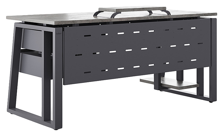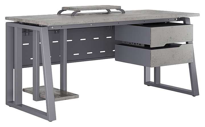Офисный стол Кобор TS2-140/70 graphite/chicagoиспользуется в офисных помещениях и кабинетах руководителей. Модель оснащена усиленными вертикальными балками опорами в форме наклонной трапеции. Каркас выполнен из металла, выкрашенного в цвет графит муар (RAL7024), столешница – из ламинированной древесно-стружечной плиты (ЛДСП) цвета бетон чикаго (F186 ST9). Опции (заказываются отдельно):