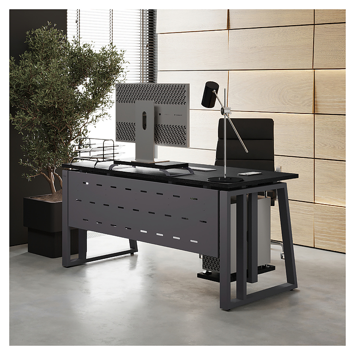 Офисный стол Кобор TS2-120/70 graphite/glazed используется в офисных помещениях и кабинетах руководителей. Модель оснащена усиленными вертикальными балками опорами в форме наклонной трапеции. Каркас выполнен из металла, выкрашенного в цвет графит муар (RAL7024), столешница – из ламинированной древесно-стружечной плиты (ЛДСП) цвета черный дуб (H3178 ST37). Опции (заказываются отдельно):