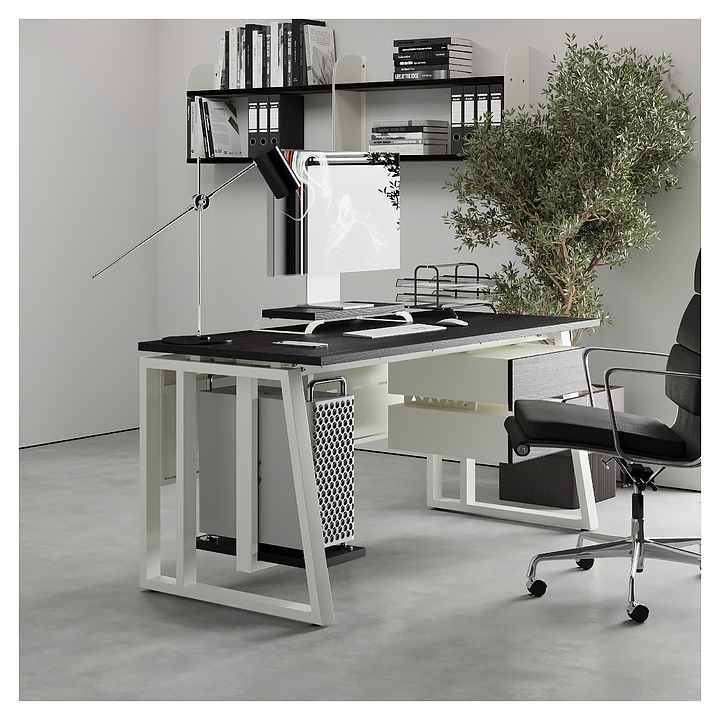 Офисный стол Кобор TS2-180/60 white/glazed используется в офисных помещениях и кабинетах руководителей. Модель оснащена усиленными вертикальными балками опорами в форме наклонной трапеции. Каркас выполнен из металла, выкрашенного в цвет белый муар (RAL9016), столешница – из ламинированной древесно-стружечной плиты (ЛДСП) цвета черный дуб (H3178 ST37). Опции (заказываются отдельно):