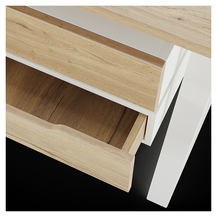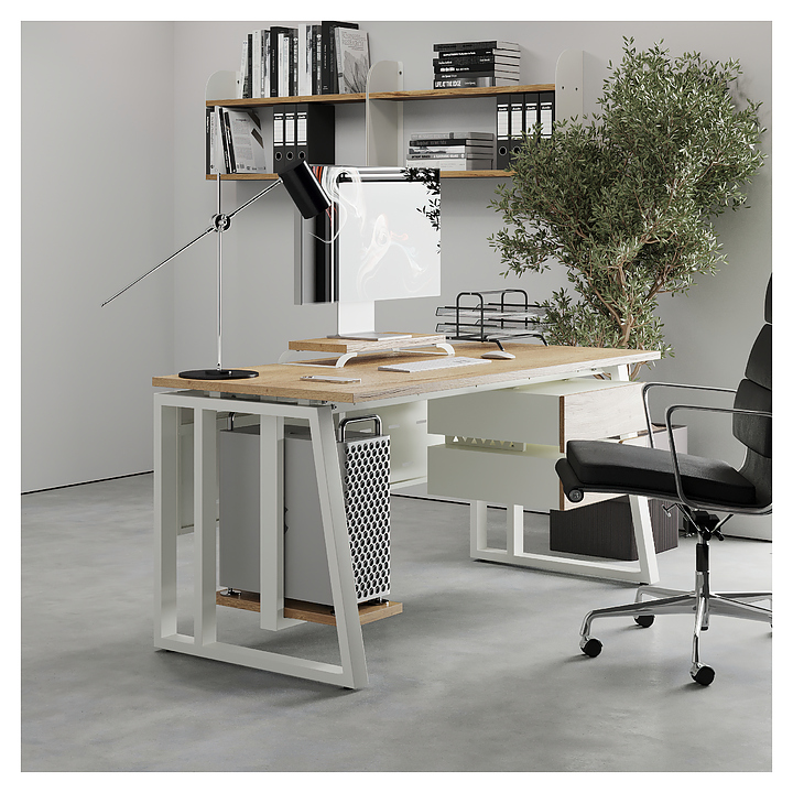 Офисный стол Кобор TS2-140/70 white/natural используется в офисных помещениях и кабинетах руководителей. Модель оснащена усиленными вертикальными балками опорами в форме наклонной трапеции. Каркас выполнен из металла, выкрашенного в цвет белый муар (RAL9016), столешница – из ламинированной древесно-стружечной плиты (ЛДСП) цвета натуральный дуб (H1180 ST37). Опции (заказываются отдельно):