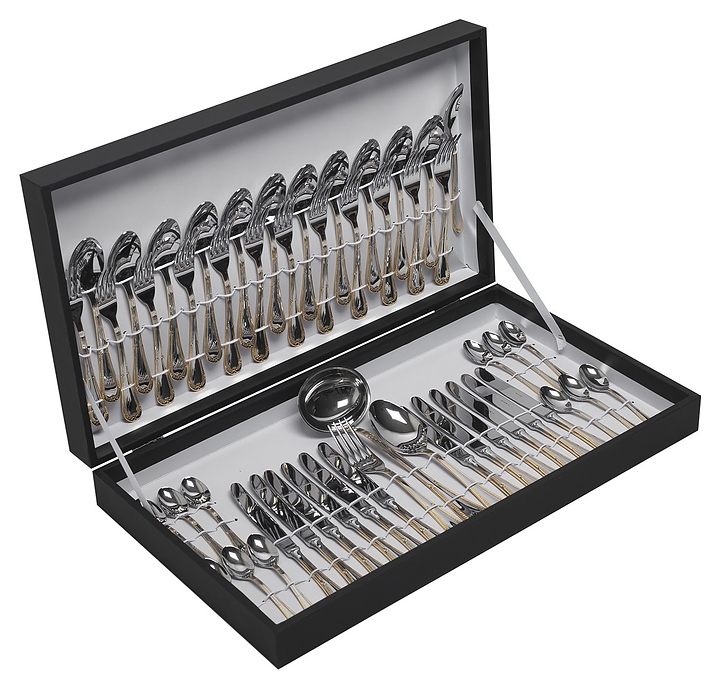 Набор столовых приборов EME Firenze Gold Decor C38FI/OR из коллекции Firenze Oro используется на предприятиях общественного питания и в домашних условиях для сервировки стола во время торжеств. Приборы изготовлены из нержавеющей стали 18/10 с глянцевой поверхностью и позолоченной окантовкой, нанесенной вручную. В комплект поставки входят 12 столовых ложек, 12 вилок, 12 столовых ножей, 12 ложек для кофе, 1 половник, 1 сервировочная вилка с 4 зубцами и сервировочная ложка. Особенности: