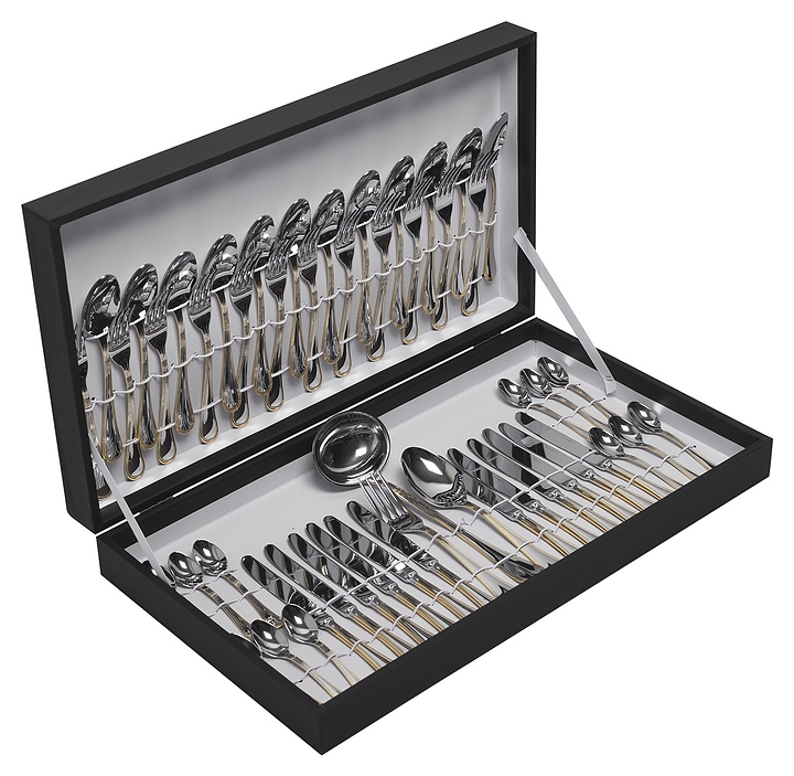 Набор столовых приборов EME Impero Gold Decor C38IM/OR используется на предприятиях общественного питания и в домашних условиях. Мягкие, закругленные ручки приборов с элегантным декором и позолоченной окантовкой подойдут для сервировки любого стола. Столовые приборы изготовлены из полированной нержавеющей стали 18/10. В комплект поставки входят 12 столовых ложек, 12 вилок, 12 столовых ножей, 12 ложек для кофе, половник, сервировочная вилка с 4 зубцами и сервировочная ложка. Особенности: