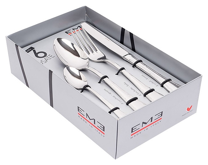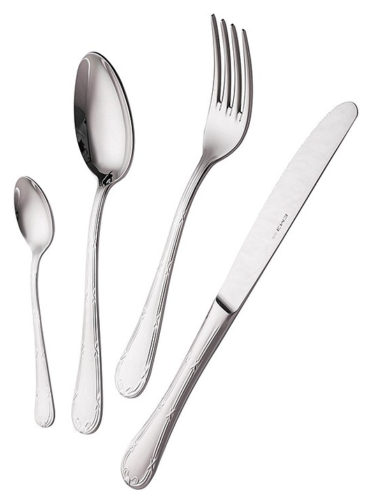 Набор столовых приборов EME Luigi XVI P16BXVI/10 используется на предприятиях общественного питания и в домашних условиях. Закругленные ручки и элегантный декор в духе французского неоклассицизма прекрасно подойдут для праздничной сервировки стола. Изделия выполнены из нержавеющей стали 18/10 с зеркальной поверхностью. В комплект поставки входят 4 столовых ложки, 4 вилки, 4 столовых ножа и 4 чайных ложки. Особенности: