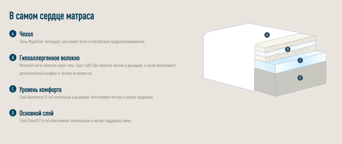 Ортопедический матрас Magniflex Magnicool 10 Soft - это практичное и износостойкое изделие из высококачественных экологически чистых материалов. Матрас сочетает в себе комфортабельность и оздоравливающий эффект, создавая необходимые условия для здорового сна. Модель средней мягкости оснащается чехлом из инновационной и эксклюзивной ткани Magnicool на основе натурального сырья, которая дарит непревзойденную свежесть, а также способствует циркуляции воздуха, создавая идеальный микроклимат между телом и матрасом. Сочетание слоев Aquabreeze и Eliosoft обеспечивает мягкую, уютную поддержку поддержку спины. Натуральные материалы обладают отличной воздухопроницаемостью. Особенности:
