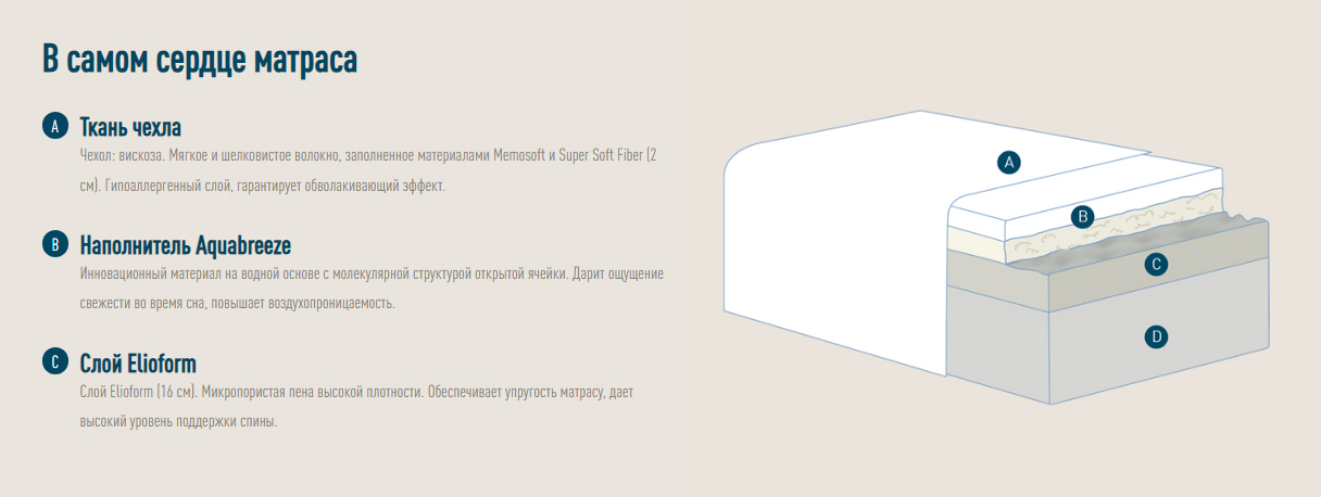 Ортопедический матрас Magniflex Abbraccio 10 - умеренно мягкая модель премиальной серии из высококачественных экологически чистых материалов. Матрас обеспечивает уникальный комфорт и расслабление, при этом оптимально поддерживает и радует роскошным исполнением. Модель подходит людям с заболеваниями спины, хронической болью и бессонницей, гарантируя полноценный отдых и расслабление. Одна сторона достаточно мягкая и комфортная, но с упругой поддержкой, другая поверхность имеет более выраженную жёсткость и упругость. Матрас оснащается чехлом из шелковистой вискозы, декорированым фигурной стежкой и элегантным узором по бокам. Волокно заполнено материалами Memosoft и Super Soft Fiber. Гипоаллергенный слой, гарантирует обволакивающий эффект. Материалы, отобранные для коллекции, отличаются мягкостью и высокой воздухопроницаемостью. Пена Elioform на основе натуральных материалов с максимальной поддержкой спины, и слой Aquabreeze на водной основе для лучшей циркуляции воздуха. Благодаря материалу Memosoft матрас обеспечивает экстра комфорт и дарит максимальное расслабление. Сочетание слоев обеспечивает отличный ортопедический эффект и расслабление мышц во время сна. Особенности: