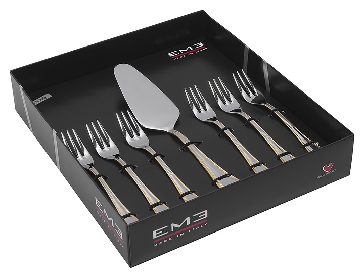 Набор для торта EME Firenze Oro C13FI/OR используется на предприятиях общественного питания и в домашних условиях для сервировки стола во время торжеств. Все приборы изготовлены из нержавеющей стали 18/10 с глянцевой поверхностью. В комплект поставки входят 6 десертных вилок и лопатка для сервировки. Особенности: