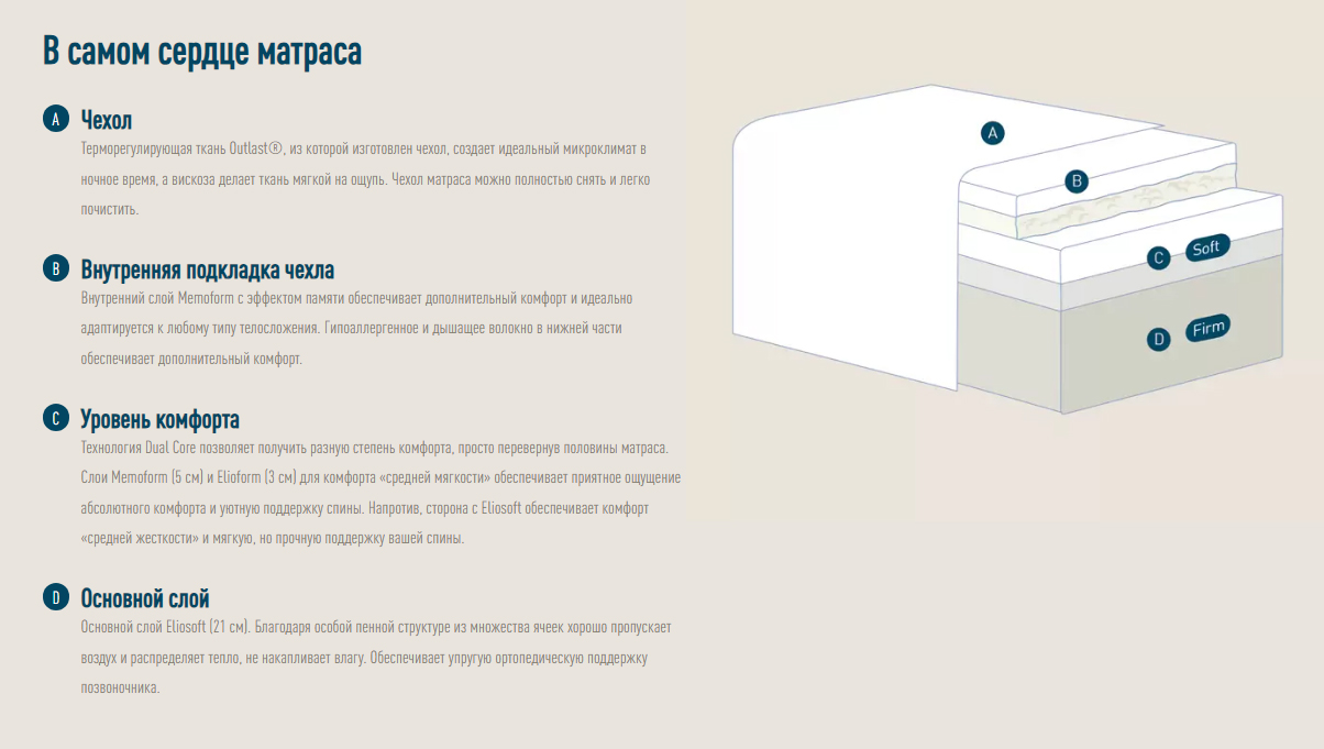 Внимание! Технология DUAL - регулируемая жесткость доступна в двуспальных матрасах в размере 150х200 и более. В матрасах размером менее 150х200 технология DUAL отсутствует, внутренний слой матраса изготовлен единым монолитным блоком.