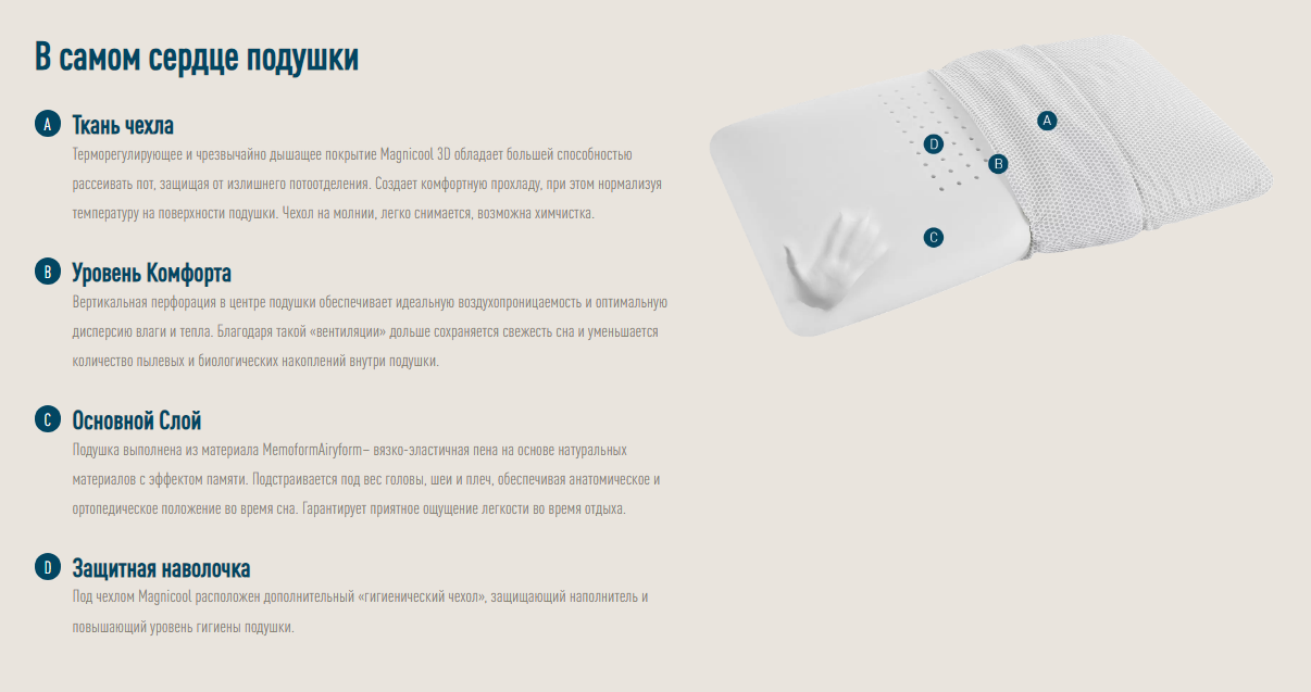Ортопедическая подушка Magniflex Magnicool 3D Standard создает условия для сна в любом положении и не требует привыкания и адаптации. Основа подушки латексная пена Memoform Airyform с эффектом памяти и перфорацией гарантирует высокий уровень циркуляции воздуха и свежесть сна и обеспечивает поддержку головы и шеи индивидуально для каждого. Ткань чехла инновационная и эксклюзивная ткань MagniCool обеспечивает непревзойденную свежесть, а также способствует циркуляции воздуха, создавая идеальный микроклимат между телом и подушкой. Особенности: