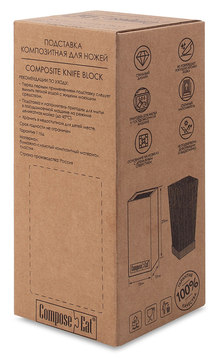Подставка ComposeEat PDN104105OA4 предназначена для хранения кухонных ножей и ножниц на предприятиях общественного питания и торговли, в частных домах и квартирах. Модель оснащена ножками и дренажным отверстием. Корпус выполнен из бумажного композитного материала, наполнитель - из пластика. Особенности:
