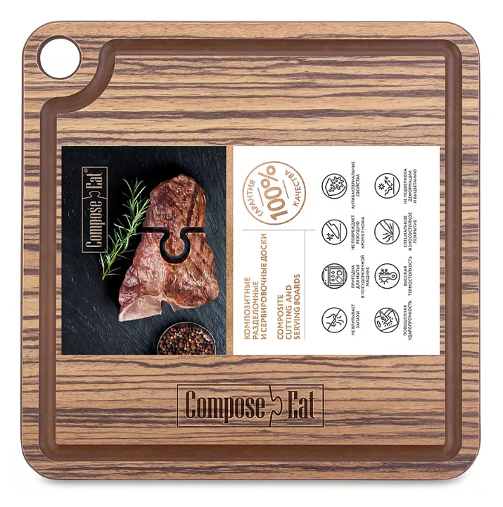 Сервировочная доска ComposeEat PGM1740654KL6 выполнена из бумажного композитного материала, сохраняющего целостность при падении, ударах и механической нагрузке, устойчивого к резким перепадам температур, не подверженному деформации, выцветанию, сколам, трещинам и механическим повреждениям. Модель оснащена желобом для слива жидкости, отверстием для подвешивания и нескользящими силиконовыми ножками. Особенности: