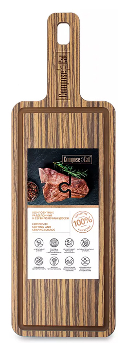Сервировочная доска ComposeEat DSJ36120654KL6 выполнена из бумажного композитного материала, сохраняющего целостность при падении, ударах и механической нагрузке, устойчивого к резким перепадам температур, не подверженному деформации, выцветанию, сколам, трещинам и механическим повреждениям. Модель оснащена желобом для слива жидкости, ручкой с отверстием для подвешивания и нескользящими силиконовыми ножками. Особенности:
