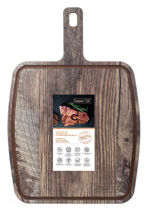 Разделочная доска ComposeEat DRRJ36250634KL6 выполнена из бумажного композитного материала, сохраняющего целостность при падении, ударах и механической нагрузке, устойчивого к резким перепадам температур, не подверженному деформации, выцветанию, сколам, трещинам и механическим повреждениям. Модель оснащена желобом для слива жидкости, ручкой с отверстием для подвешивания и нескользящими силиконовыми ножками. Особенности: