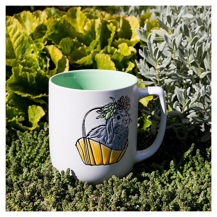 Кружка P.L. Proff Cuisine Кроличья доброта предназначена для подачи чая и других напитков напитков в процессе сервировки стола на предприятиях общественного питания и торговли, а также в домашних условиях. Модель круглого сечения оснащена рукояткой. Изделие выполнено из керамики, внутренняя поверхность зеленого цвета, внешняя – белая с принтом нарисованного кролика, упаковка – картонная коробка. Особенности: