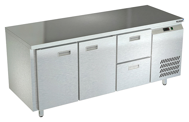 Морозильный стол Техно-ТТ СПБ/М-122/22-1806 предназначен для раскатки теста, обработки, заморозки и долговременного хранения продуктов, полуфабрикатов, напитков и мороженого на предприятиях общественного питания и торговли. Модель оснащена 2 секциями с 2 дверьми и регулируемой полкой-решеткой, 1 секцией с 2 ящиками, направляющими с доводчиками (Австрия), петлями-доводчиками (Польша) и круглыми ножками, регулируемыми по высоте на 50 мм (Италия). Корпус и столешница выполнены из нержавеющей стали AISI 430, задняя стенка и дно - из оцинкованной стали. Стол поставляется в собранном виде. Особенности: