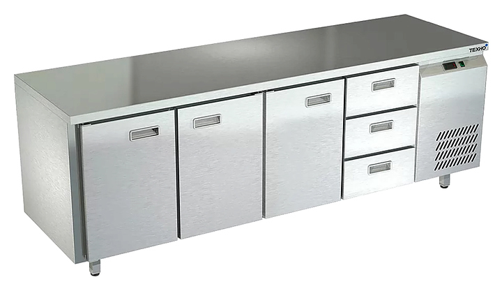 Морозильный стол Техно-ТТ СПБ/М-122/33-2207 предназначен для раскатки теста, обработки, заморозки и долговременного хранения продуктов, полуфабрикатов, напитков и мороженого на предприятиях общественного питания и торговли. Модель оснащена 3 секциями с 3 дверьми и регулируемой полкой-решеткой, 1 секцией с 3 ящиками, направляющими с доводчиками (Австрия), петлями-доводчиками (Польша) и круглыми ножками, регулируемыми по высоте на 50 мм (Италия). Корпус и столешница выполнены из нержавеющей стали AISI 430, задняя стенка и дно - из оцинкованной стали. Стол поставляется в собранном виде. Особенности: