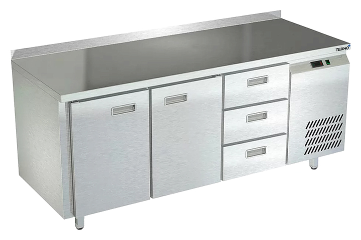 Морозильный стол Техно-ТТ СПБ/М-222/23-1807 предназначен для раскатки теста, обработки, заморозки и долговременного хранения продуктов, полуфабрикатов, напитков и мороженого на предприятиях общественного питания и торговли. Модель оснащена 2 секциями с 2 дверьми и регулируемой полкой-решеткой, 1 секцией с 3 ящиками, направляющими с доводчиками (Австрия), петлями-доводчиками (Польша), бортом и круглыми ножками, регулируемыми по высоте на 50 мм (Италия). Корпус и столешница выполнены из нержавеющей стали AISI 430, задняя стенка и дно - из оцинкованной стали. Стол поставляется в собранном виде. Особенности: