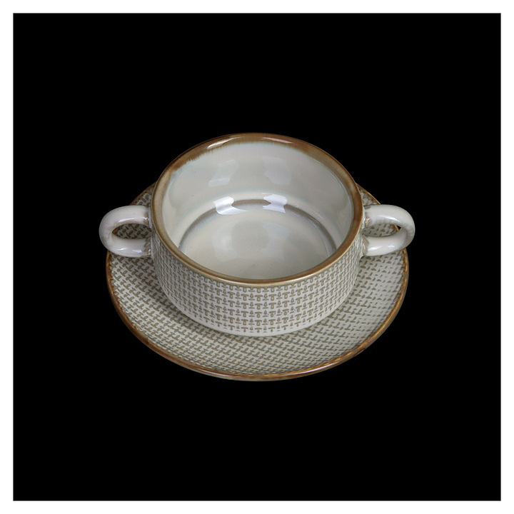 Блюдце для бульонной чашки Corone Alveare HS179489 предназначено для профессионального использования в ресторанах. Модель имеет круглую форму, окантовку цвета теплой сепии и уникальный декор, схожий с текстурой холста для живописи. Посуда изготавливается из профессионального прочного фарфора цвета льняного семени. Особенности:
