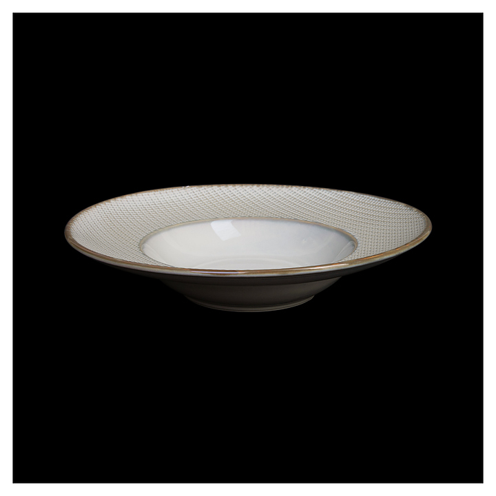 Тарелка для пасты Corone Alveare HS179468 предназначена для профессионального использования в ресторанах. Модель имеет круглую форму, окантовку цвета теплой сепии и уникальный декор, схожий с текстурой холста для живописи. Посуда изготавливается из профессионального прочного фарфора цвета льняного семени. Особенности: