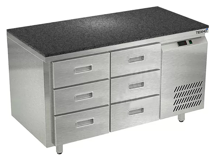Морозильный стол Техно-ТТ СПБ/М-323/06-1306 предназначен для раскатки теста, обработки, заморозки и долговременного хранения продуктов, полуфабрикатов, напитков и мороженого на предприятиях общественного питания и торговли. Модель оснащена 2 секциями с 6 ящиками, направляющими с доводчиками (Австрия) и круглыми ножками, регулируемыми по высоте на 50 мм (Италия). Корпус выполнен из нержавеющей стали AISI 430, задняя стенка и дно - из оцинкованной стали, столешница - из камня. Стол поставляется в собранном виде. Особенности: