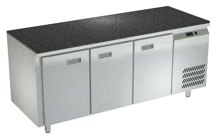 Морозильный стол Техно-ТТ СПБ/М-321/30-1806 предназначен для раскатки теста, обработки, заморозки и долговременного хранения продуктов, полуфабрикатов, напитков и мороженого на предприятиях общественного питания и торговли. Модель оснащена 3 секциями с 3 дверьми и регулируемой полкой-решеткой, петлями-доводчиками (Польша) и круглыми ножками, регулируемыми по высоте на 50 мм (Италия). Корпус выполнен из нержавеющей стали AISI 430, задняя стенка и дно - из оцинкованной стали, столешница - из камня. Стол поставляется в собранном виде. Особенности: