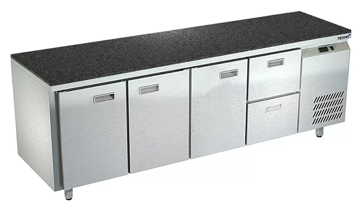 Морозильный стол Техно-ТТ СПБ/М-322/32-2207 предназначен для раскатки теста, обработки, заморозки и долговременного хранения продуктов, полуфабрикатов, напитков и мороженого на предприятиях общественного питания и торговли. Модель оснащена 3 секциями с 3 дверьми и регулируемой полкой-решеткой, 1 секцией с 2 ящиками, направляющими с доводчиками (Австрия), петлями-доводчиками (Польша) и круглыми ножками, регулируемыми по высоте на 50 мм (Италия). Корпус выполнен из нержавеющей стали AISI 430, задняя стенка и дно - из оцинкованной стали, столешница - из камня. Стол поставляется в собранном виде. Особенности: