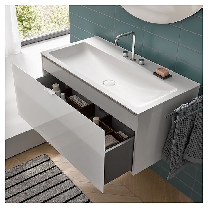 Тумба под раковину EMCO Evo Vanity units выполнена в современном стиле и отлично дополнит интерьер ванной комнаты. Благодаря подвесной конструкции модель не занимает много места, что экономит пространство в ванной комнате и облегчает уборку. Модель оснащена выджвижным ящиком с вырезом под сифон. Фасад изделия выполнен из стекла. Тумба используется вместе с накладной раковиной Vanity units 9577 114 21. Раковина в комплект поставки не входит и приобретается отдельно. Особенности: