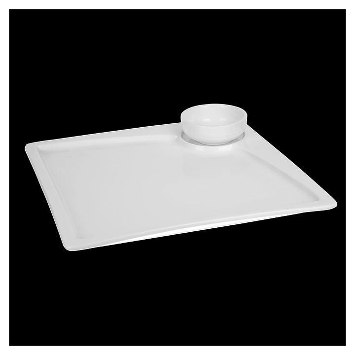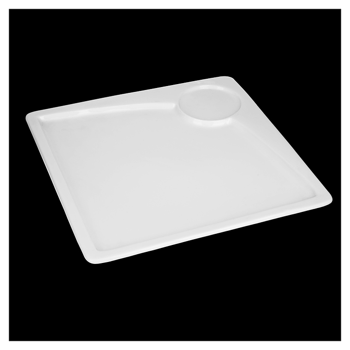 Квадратное блюдо Sam&Squito Quadro 245х245 мм предназначено для подачи завтраков в процессе сервировки стола хлебобулочных изделий, колбас, сыров, различных закусок и блюд на предприятиях общественного питания и торговли, а также в домашних условиях. Модель квадратной формы оснащена углублением для соусника. Изделие выполнено из высококачественного фарфора белого цвета с глянцевой поверхностью. Особенности: