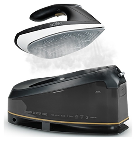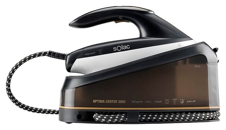 Паровая станция Solac Optima Center 3000 CPB6100 используется в гостиницах, ателье, а также домашних условиях для разглаживания складок на одежде, белье и шторах из различных тканей, а также для термической дезинфекции изделий с помощью струи горячего пара. Модель оснащена электронагревателем с насосом, кабелем питания с вилкой, утюгом с подошвой каплевидной формы с большим количеством паровых отверстий, термоизолированным шлангом, рукояткой обтекаемой формы и электромеханическим управлением. Корпус утюга и каркас резервуара выполнены из термостойкого ударопрочного пластика черного цвета, нижняя окантовка утюга – из пластика белого цвета, стенки резервуара – из полупрозрачного полимера, подошва утюга – из керамики. Особенности: