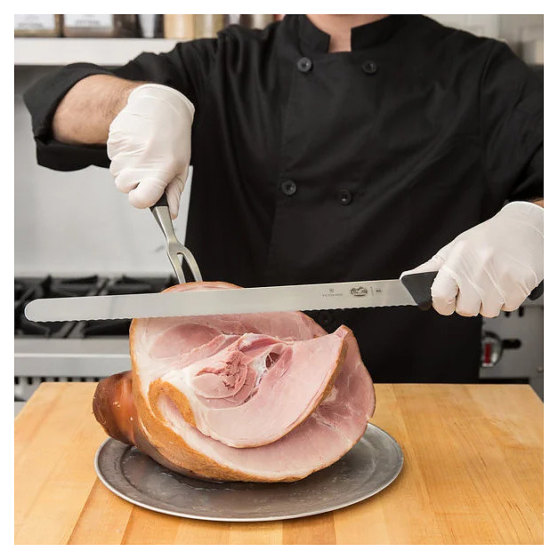 Нож Victorinox 5.4233.36 Fibrox используется для нарезания ломтиками запеченных мяса, птицы, мясных полуфабрикатов и аналогичных продуктов на предприятиях общественного питания и в домашних условиях. Модель оснащена лезвием с зубчатой режущей кромкой и округлым наконечником. Клинок выполнен из высококачественной мартенситной нержавеющей стали с полированной поверхностью, рукоятка – из комбинированного полимера фиброкс: твердая внутренняя часть – из полипропилена (PP), внешняя – из термопластичного эластомера (TPE) черного цвета. Особенности:
