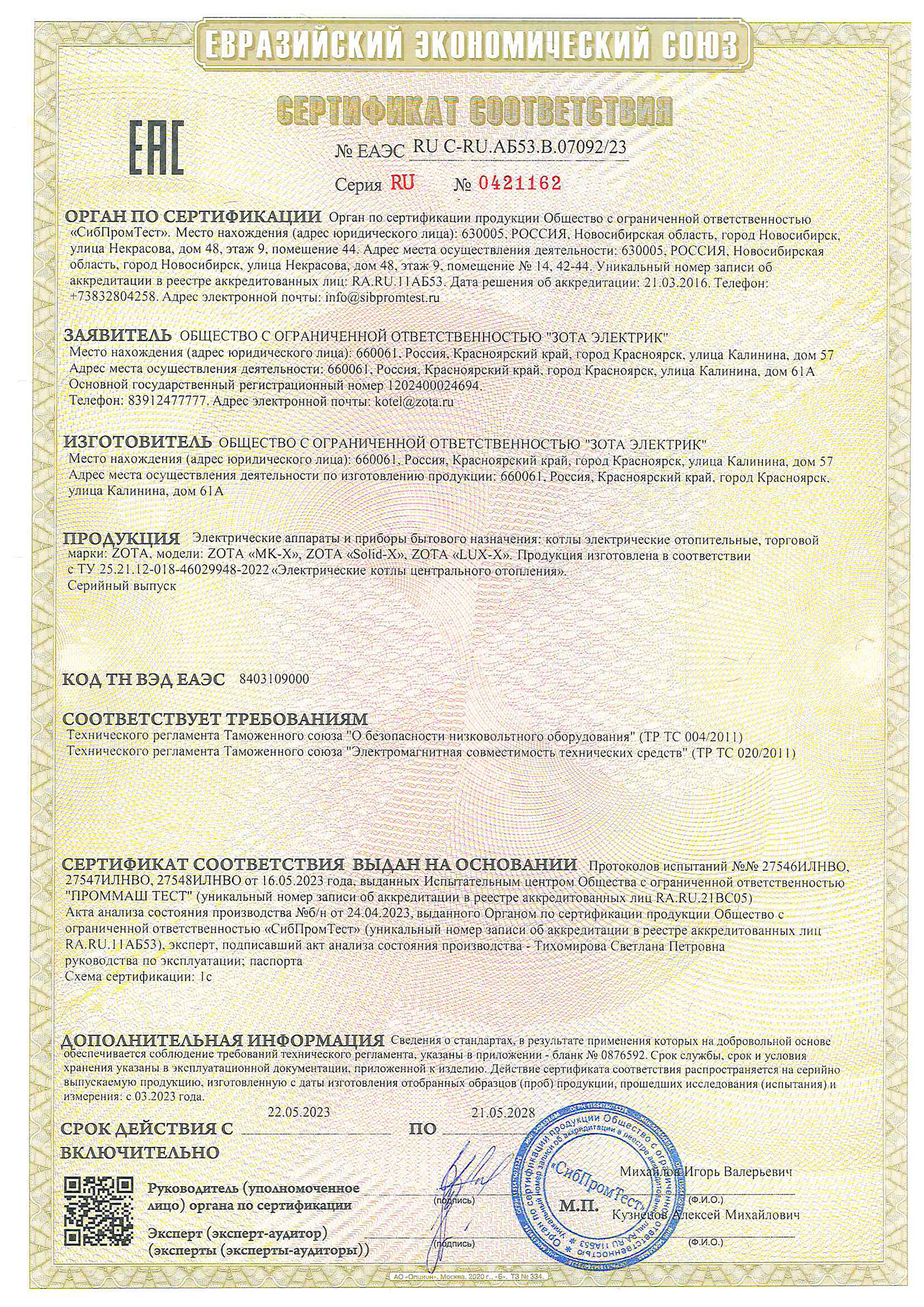 Российская компания Zota производит электрические котлы мощностного диапазона от 3 до 400 киловатт. Ассортимент включает 5 линеек твердотопливных и комбинированных котлов, электросауны, приборы КиП, ТЭНы любой мощности и конфигурации, автоматические твердотопливные котлы - пеллетные и угольные.