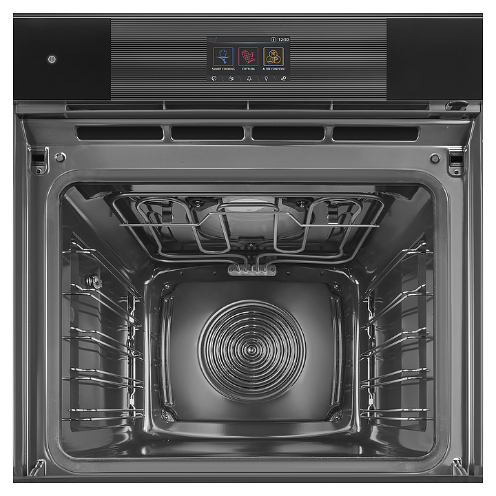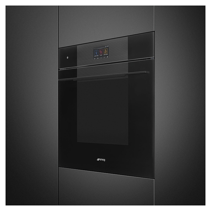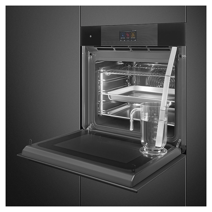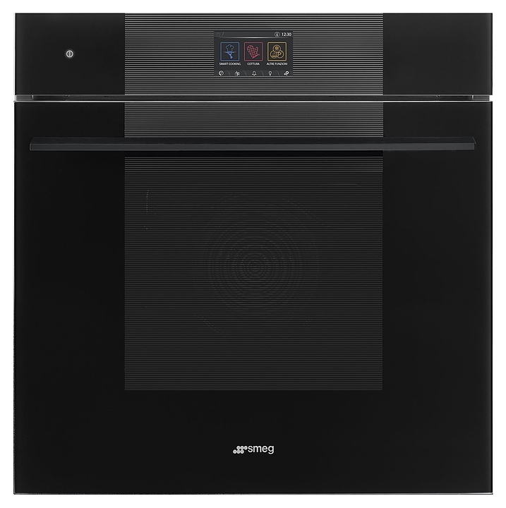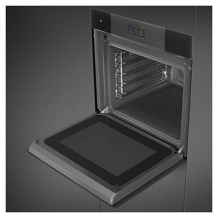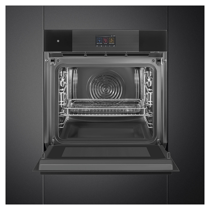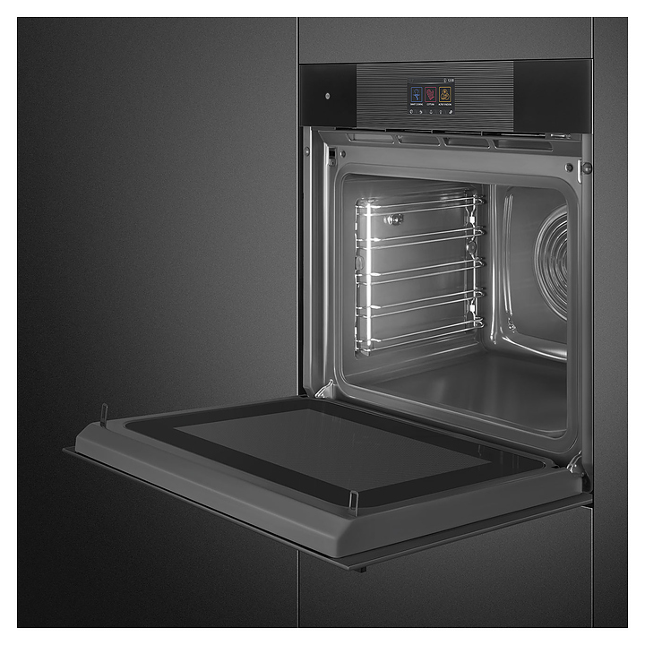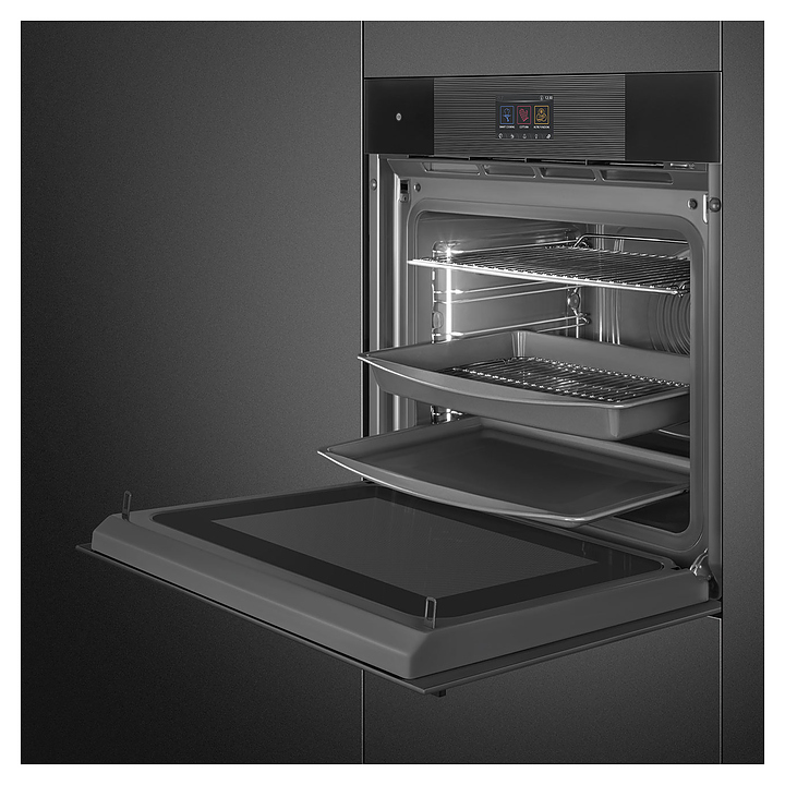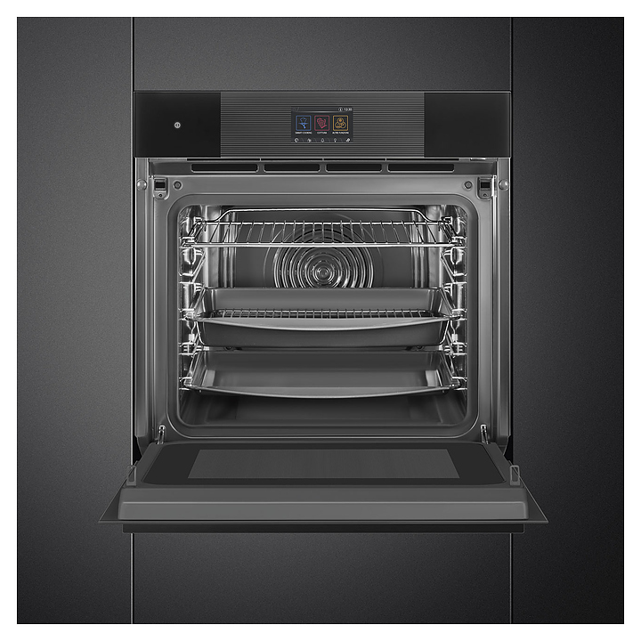 Электрический духовой шкаф SMEG SO6104APB3 предназначен для приготовления большого ассортимента блюд в домашних условиях. Модель оснащена просторной рабочей камерой Galileo с верхним и нижним нагревательными элементами, грилем, расположенными в задней стенке кольцевым нагревателем и вентилятором, магнетроном, парогенератором, 2 съемными стойками с 5 уровнями направляющих для противней, откидной дверью со смотровым окном и длинной уплощенной горизонтальной рукояткой, сенсорным управлением с цветным TFT-дисплеем (VIVO Screen). Корпус выполнен из высококачественной стали, фронт c глянцевым покрытием черного цвета и полным остеклением прозрачным стеклом без винтового крепежа, рукоятка – из металла с сатинированной серебристой поверхностью, сплошной глубокий противень – из эмалированной стали, стойки с направляющими, стандартный и перфорированный противни – из нержавеющей стали.