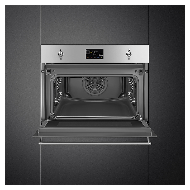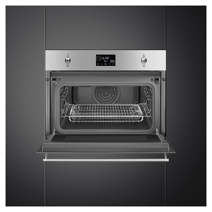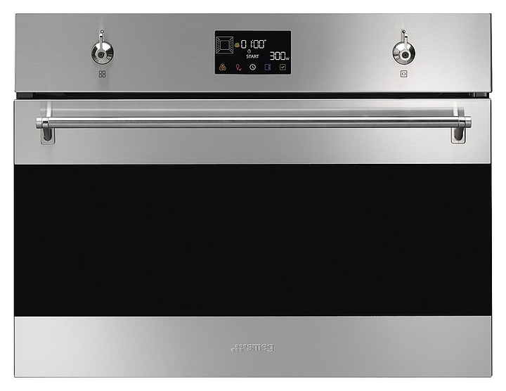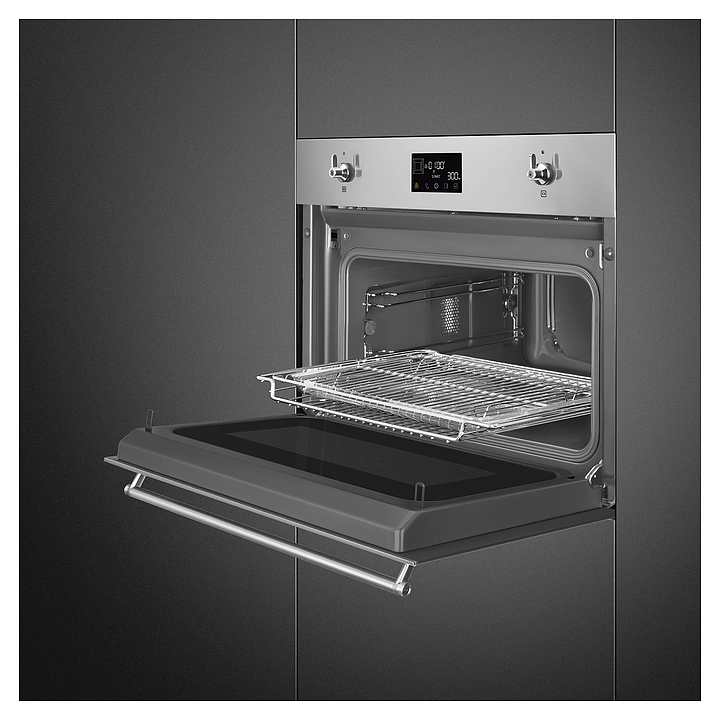 Электрический духовой шкаф SMEG SO4302M1X предназначен для приготовления большого ассортимента блюд в домашних условиях. Модель оснащена рабочей камерой с верхним и нижним нагревательными элементами, грилем, расположенными в задней стенке кольцевым нагревателем и вентилятором, магнетроном, 2 съемными стойками с 2 уровнями направляющих для противней, откидной дверью со смотровым окном и длинной трубчатой горизонтальной рукояткой, панелью управления с 2 поворотными переключателями, сенсорной клавиатурой и жидкокристаллическим дисплеем (EVO Screen). Корпус выполнен из высококачественной стали, фронт – из нержавеющей стали с сатинированной поверхностью, защитной обработкой от отпечатков пальцев и частичным внешним остеклением двери тонированным стеклом Eclipse без винтового крепежа, фурнитура – из металла с серебристой поверхностью, стойки с направляющими и решетки – из нержавеющей стали, противень – из термостойкого боросиликатного стекла пирекс.