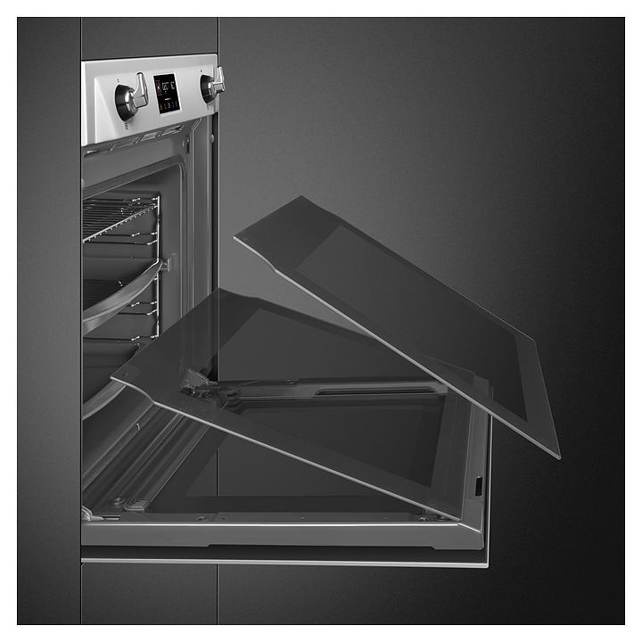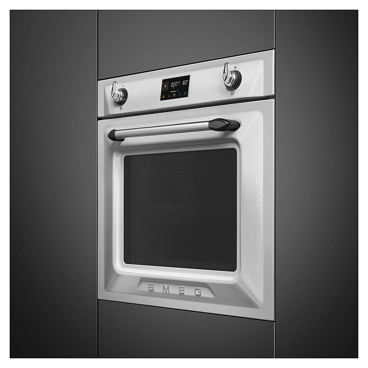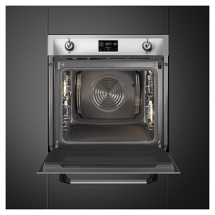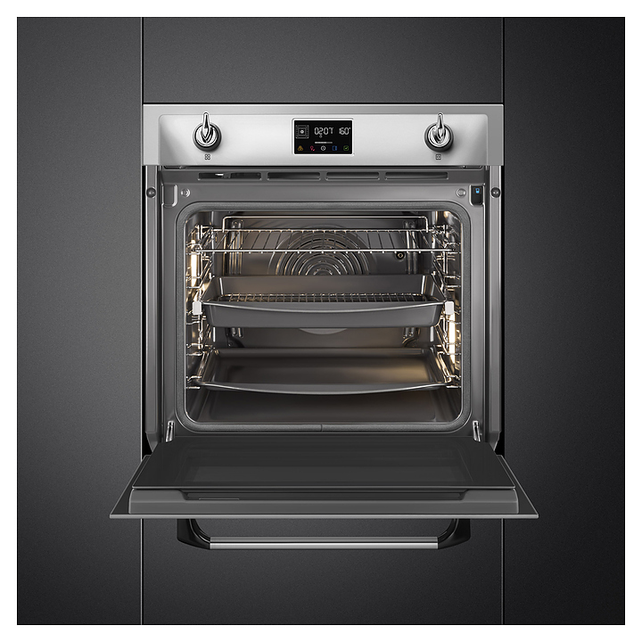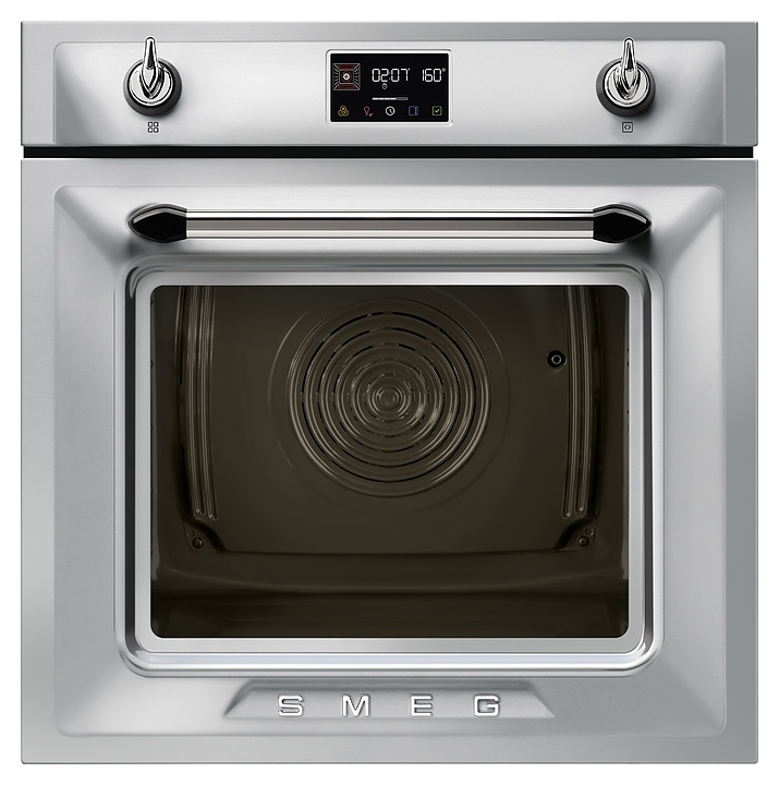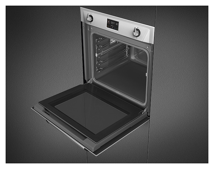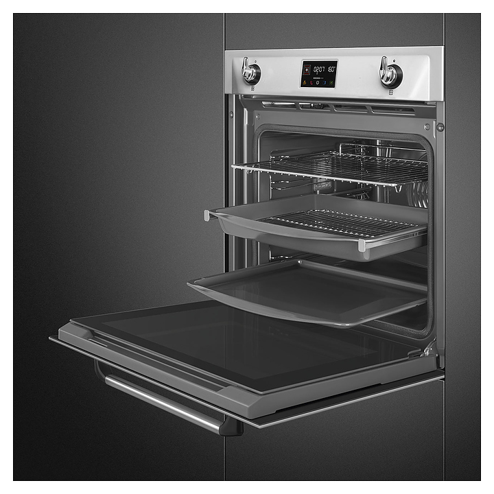 Электрический духовой шкаф SMEG SOP6902S2PX предназначен для приготовления большого ассортимента блюд в домашних условиях. Модель оснащена рабочей камерой с верхним и нижним нагревательными элементами, грилем, расположенными в задней стенке кольцевым нагревателем и вентилятором, парогенератором, 2 съемными стойками с 5 уровнями направляющих для противней, откидной дверью с прямоугольным смотровым окном и трубчатой горизонтальной рукояткой, панелью управления с 2 поворотными переключателями и цветным жидкокристаллическим дисплеем (EVO Screen). Корпус выполнен из высококачественной стали, фронт с фактурными выпуклостями на верхней панели и двери – из нержавеющей стали с обработкой от отпечатков пальцев и остеклением окна прозрачным стеклом, фурнитура – из металла с сатинированной серебристой поверхностью, держатели рукоятки –из пластика с черной поверхностью, противни – из эмалированной стали, стойки с направляющими и решетки – из нержавеющей стали.