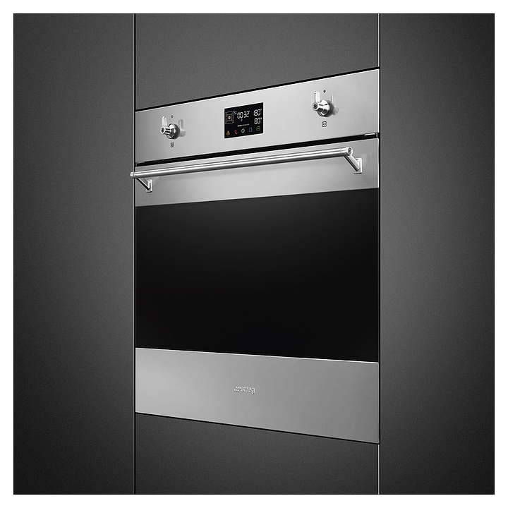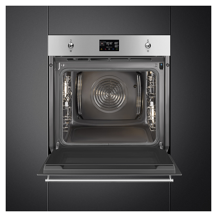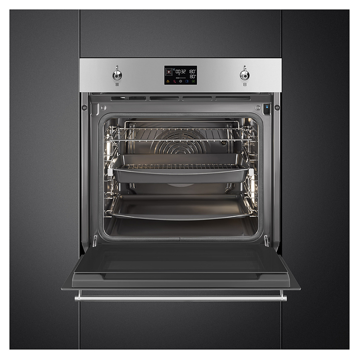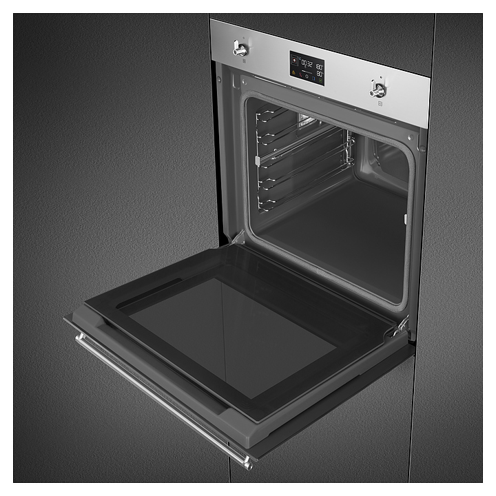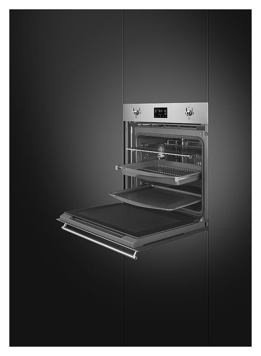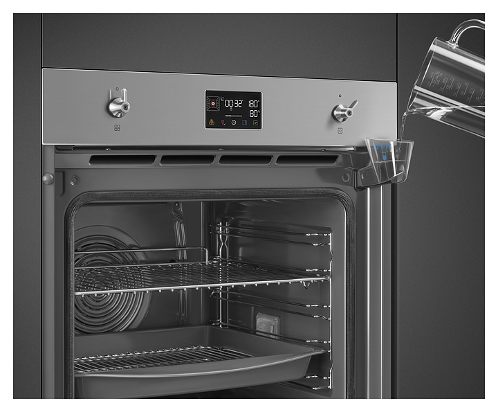 Электрический духовой шкаф SMEG SOP6302S2PX предназначен для приготовления большого ассортимента блюд в домашних условиях. Модель оснащена рабочей камерой с верхним и нижним нагревательными элементами, грилем, расположенными в задней стенке кольцевым нагревателем и вентилятором, парогенератором, 2 съемными стойками с 5 уровнями направляющих для противней, откидной дверью со смотровым окном и длинной трубчатой горизонтальной рукояткой, панелью управления с 2 поворотными переключателями и цветным жидкокристаллическим дисплеем (EVO Screen). Корпус выполнен из высококачественной стали, фронт – из нержавеющей стали с обработкой от отпечатков пальцев, частичным внешним остеклением двери стеклом Eclipse с черной тонировкой, фурнитура – из металла с сатинированной серебристой поверхностью, противни – из эмалированной стали, стойки с направляющими и решетки – из нержавеющей стали.