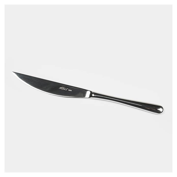Нож Noble New York S125-10 используется в качестве столового прибора при подаче стейка на предприятиях общественного питания и в домашних условиях. Модель оснащена головкой с зазубренным лезвием, заостренным острием и рукояткой обтекаемой формы с округлым наконечником. Изделие выполнено из нержавеющей стали с глянцевой серебристой поверхностью. Дополнительные характеристики: