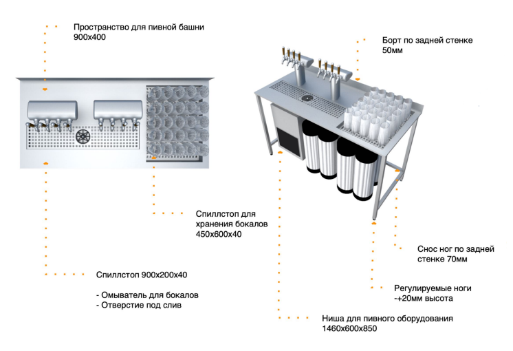 Пивной модуль BARMADE 1500х700х900 мм предназначен для размещения пивного оборудования и эффективной организации барного места на предприятиях общественного питания и торговли. Модель оснащена стендом на 4 опорах. Изделие выполнено из нержавеющей стали марки AISI430, опоры – из профиля трубы квадратного сечения. Пивное оборудование не входит в комплект поставки и приобретается отдельно. Комплектация: