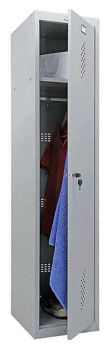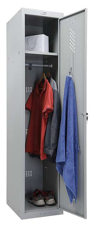 Шкаф для одежды ПРОМЕТ Практик Усиленный ML-11-40 используется на предприятиях общественного питания и торговли, а также в производственных помещениях для хранения одежды и личных вещей персонала. Модель оснащена запираемой на ключ распашной дверцей, полкой, перекладиной и крючками. Корпус выполнен из стали, окрашенной методом порошкового напыления. Особенности: