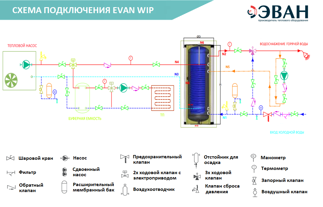 Бойлер косвенного нагрева ЭВАН WIP-HT-300 используется для организации горячего водоснабжения с геотермальными и воздушными тепловыми насосами в жилых и загородных частных домах, а также других бытовых и хозяйственных объектах. Модель оснащена внутренним баком, спиральным теплообменником, резьбовыми штуцерами для подключения теплового насоса к контуру теплообменника, подвода холодной и выхода горячей воды и защитной крышкой. Бак выполнен из стали с внутренним эмалированным покрытием, соответствующим стандарту DIN 4753, теплоизоляция – из полиуретана. Особенности: