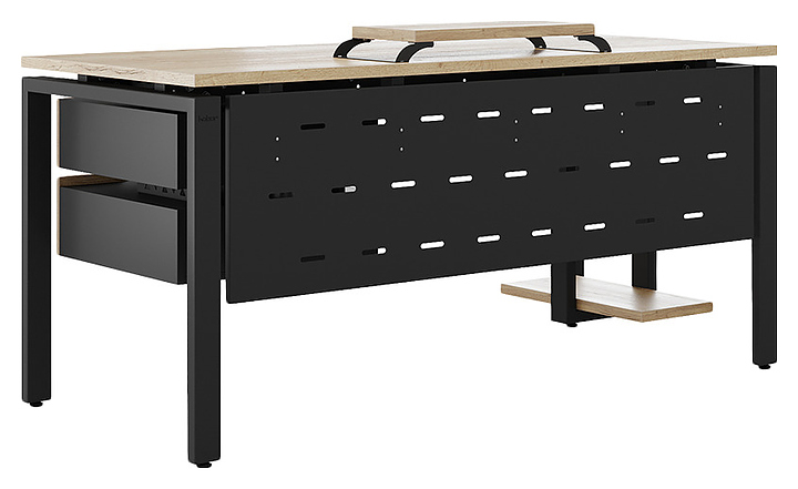 Офисный стол Кобор KP-120/80 black/natural используется в офисных помещениях и кабинетах руководителей. Модель оснащена П-образными опорами. Каркас выполнен из металла, выкрашенного в цвет черный муар (RAL9005), столешница – из ламинированной древесно-стружечной плиты (ЛДСП) цвета натуральный дуб (H1180 ST37). Опции (заказываются отдельно):