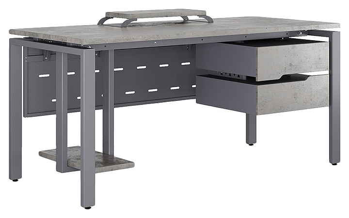 Компьютерный стол Кобор КP-80/70 graphite/chicago используется в офисных помещениях и кабинетах руководителей. Модель оснащена П-образными опорами. Каркас выполнен из металла, выкрашенного в цвет графит муар (RAL7024), столешница – из ламинированной древесно-стружечной плиты (ЛДСП) цвета бетон чикаго (F186 ST9). Опции (заказываются отдельно):