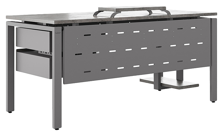 Компьютерный стол Кобор КP-120/80 aluminum/chicago используется в офисных помещениях и кабинетах руководителей. Модель оснащена П-образными опорами. Каркас выполнен из металла, выкрашенного в цвет алюминиевый металлик (RAL9006), столешница – из ламинированной древесно-стружечной плиты (ЛДСП) цвета бетон чикаго (F186 ST9). Опции (заказываются отдельно):
