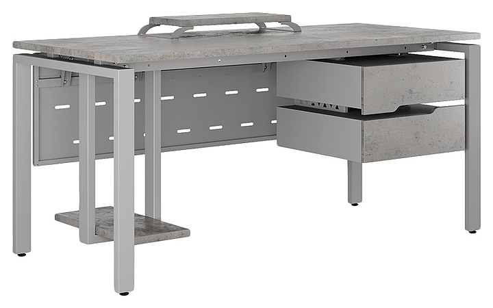 Компьютерный стол Кобор КP-160/80 aluminum/chicago используется в офисных помещениях и кабинетах руководителей. Модель оснащена П-образными опорами. Каркас выполнен из металла, выкрашенного в цвет алюминиевый металлик (RAL9006), столешница – из ламинированной древесно-стружечной плиты (ЛДСП) цвета бетон чикаго (F186 ST9). Опции (заказываются отдельно):