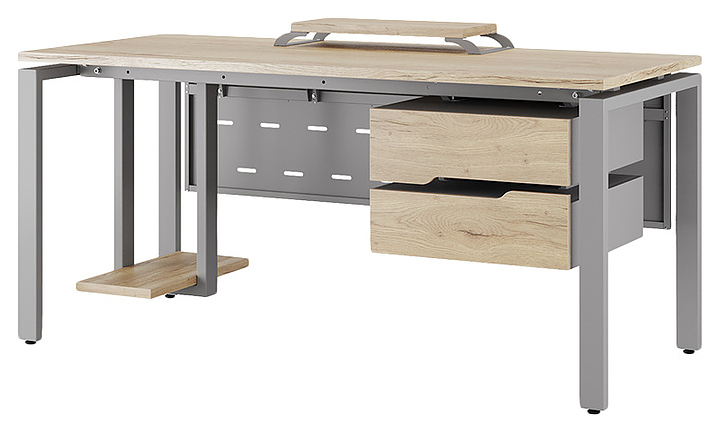 Компьютерный стол Кобор КP-140/80 aluminum/natural используется в офисных помещениях и кабинетах руководителей. Модель оснащена П-образными опорами. Каркас выполнен из металла, выкрашенного в цвет алюминиевый металлик (RAL9006), столешница – из ламинированной древесно-стружечной плиты (ЛДСП) цвета натуральный дуб (H1180 ST37). Опции (заказываются отдельно):