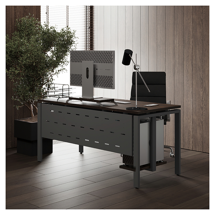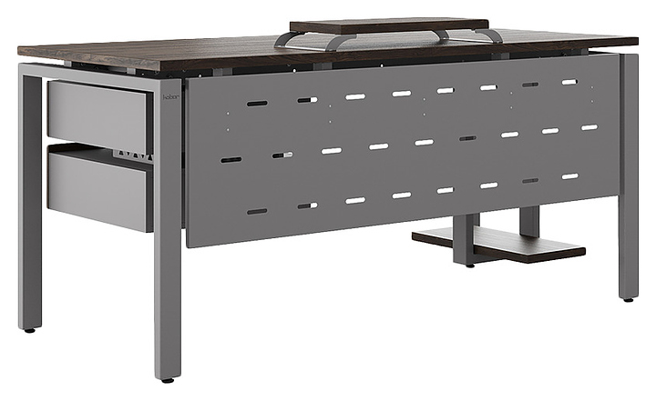 Компьютерный стол Кобор КP-120/70 aluminum/charlston используется в офисных помещениях и кабинетах руководителей. Модель оснащена П-образными опорами. Каркас выполнен из металла, выкрашенного в цвет алюминиевый металлик (RAL9006), столешница – из ламинированной древесно-стружечной плиты (ЛДСП) цвета дуб чарльстон (H3154 ST36). Опции (заказываются отдельно):