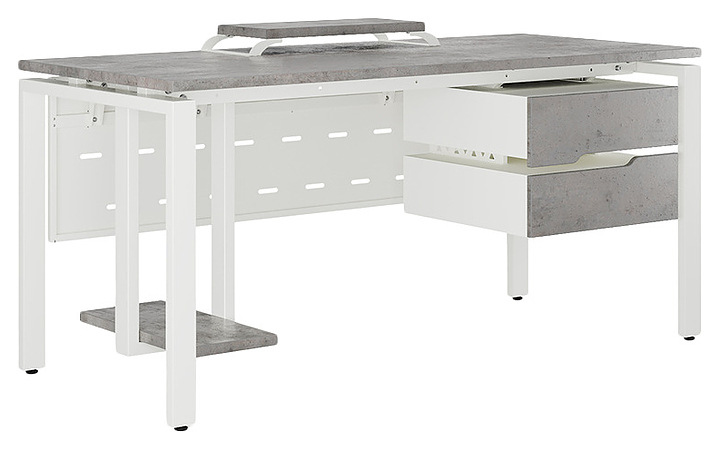 Компьютерный стол Кобор КP-160/80 white/chicago используется в офисных помещениях и кабинетах руководителей. Модель оснащена П-образными опорами. Каркас выполнен из металла, выкрашенного в цвет белый муар (RAL9016), столешница – из ламинированной древесно-стружечной плиты (ЛДСП) цвета бетон чикаго (F186 ST9). Опции (заказываются отдельно):