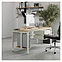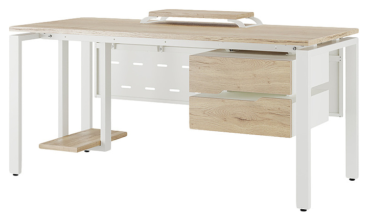 Компьютерный стол Кобор КP-120/80 white/natural используется в офисных помещениях и кабинетах руководителей. Модель оснащена П-образными опорами. Каркас выполнен из металла, выкрашенного в цвет белый муар (RAL9016), столешница – из ламинированной древесно-стружечной плиты (ЛДСП) цвета натуральный дуб (H1180 ST37). Опции (заказываются отдельно):