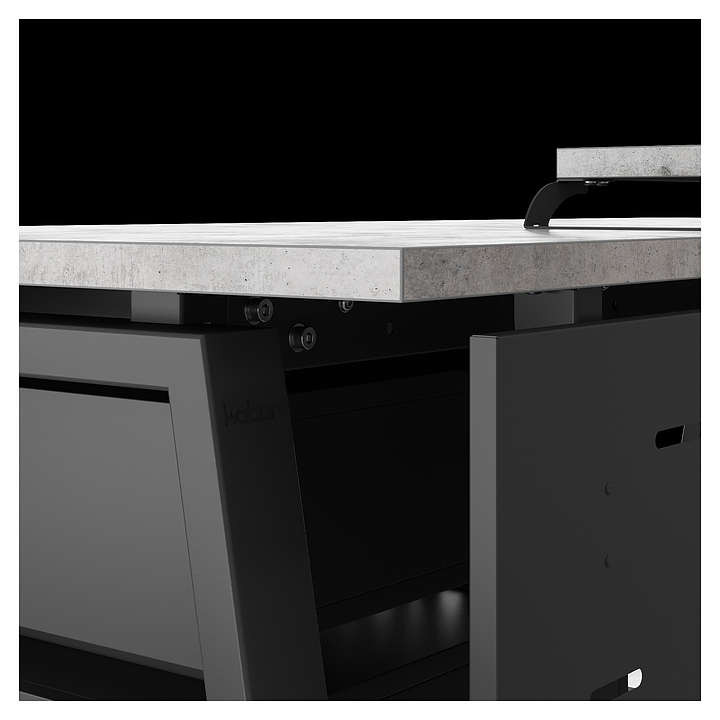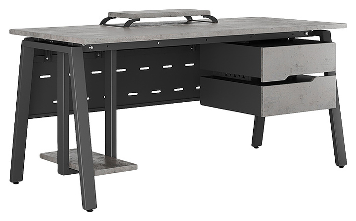 Компьютерный стол Кобор KA-120/70 black/chicago используется в офисных помещениях и кабинетах руководителей. Модель оснащена A-образными опорами. Каркас выполнен из металла, выкрашенного в цвет черный муар (RAL9005), столешница – из ламинированной древесно-стружечной плиты (ЛДСП) цвета бетон чикаго (F186 ST9). Опции (заказываются отдельно):