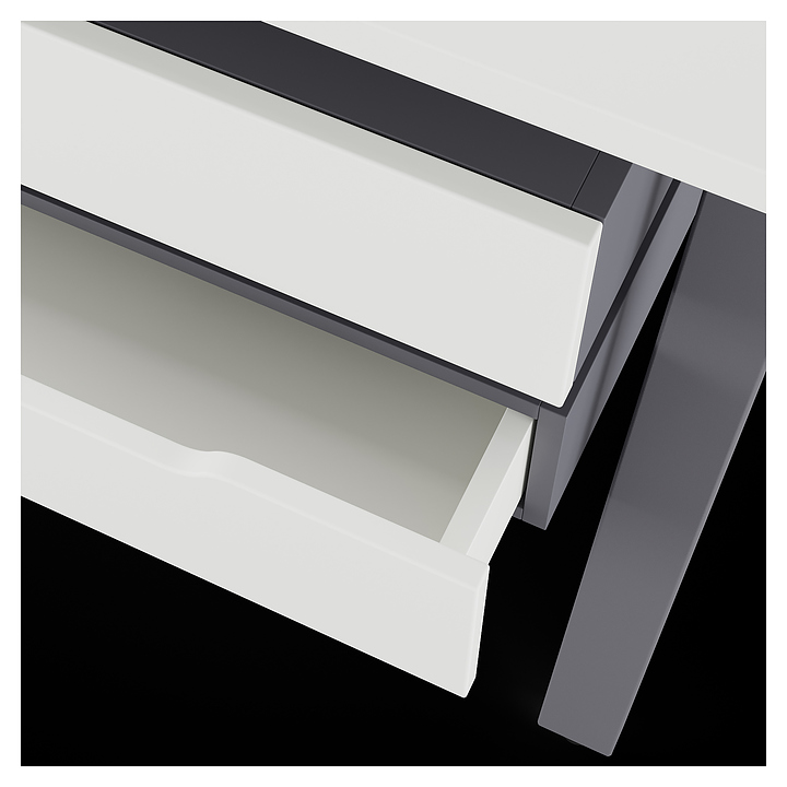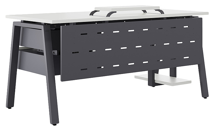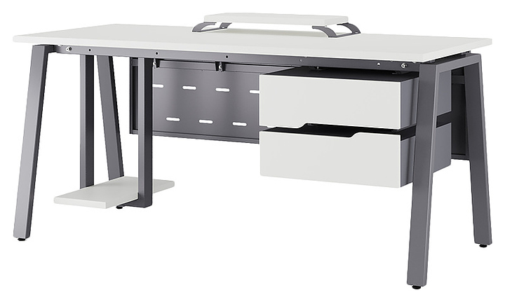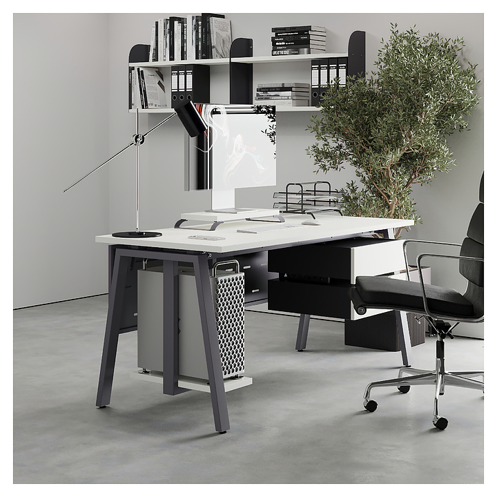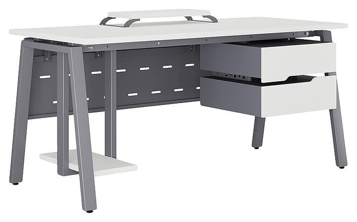 Компьютерный стол Кобор KA-80/70 graphite/premium используется в офисных помещениях и кабинетах руководителей. Модель оснащена A-образными опорами. Каркас выполнен из металла, выкрашенного в цвет графит муар (RAL7024), столешница – из ламинированной древесно-стружечной плиты (ЛДСП) цвета белый премиум (W1000 ST9). Опции (заказываются отдельно):