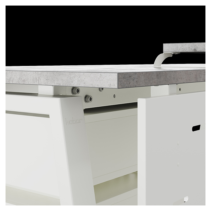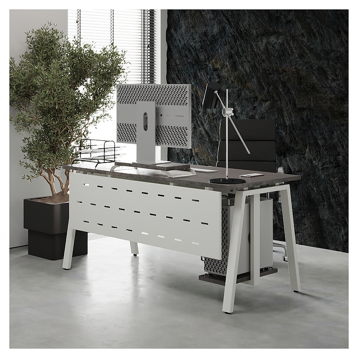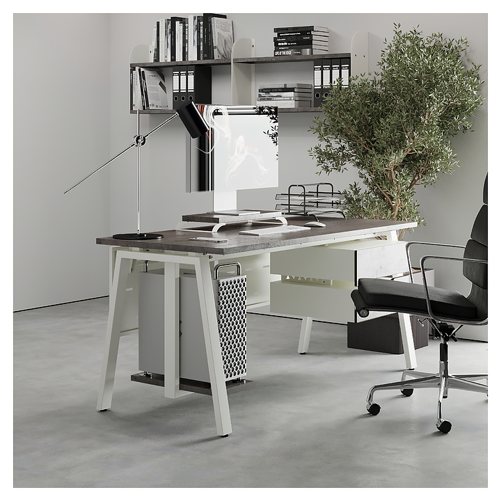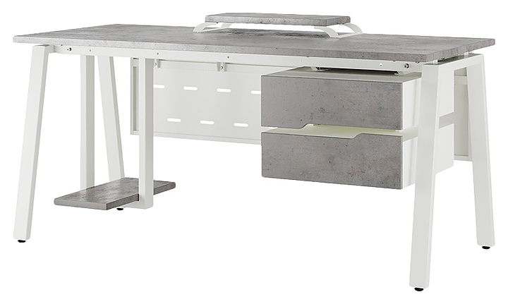 Компьютерный стол Кобор KA-140/60 white/chicago используется в офисных помещениях и кабинетах руководителей. Модель оснащена A-образными опорами. Каркас выполнен из металла, выкрашенного в цвет белый муар (RAL9016), столешница – из ламинированной древесно-стружечной плиты (ЛДСП) цвета бетон чикаго (F186 ST9). Опции (заказываются отдельно):